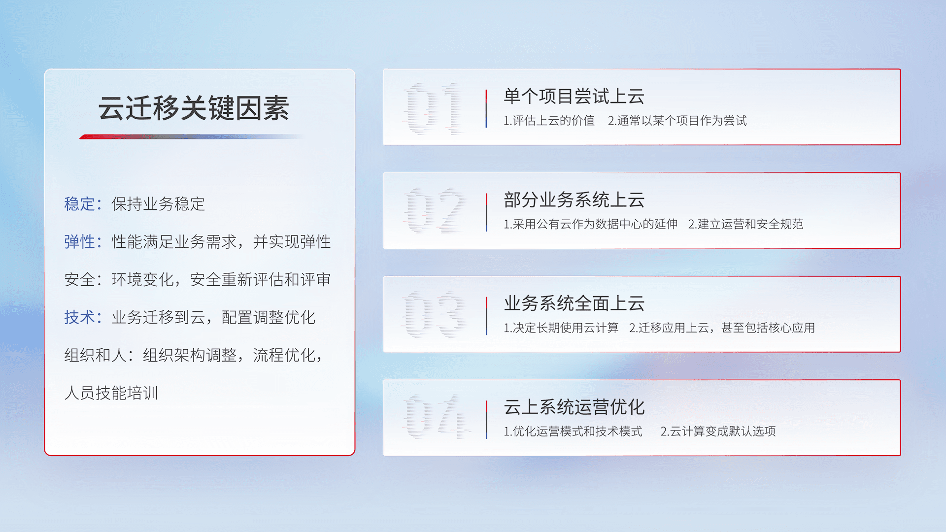 结合实际业务,,,,从规划设计、、、、云平台选型、、、、云原生改造、、、数据迁移、、、集成交付,,,,迁移全过程为客户识别最佳上云路径,,做好风险识别管理,,,设计网络架构、、、、身份权限、、、安全审计合规、、、操作审计、、、、日志审计、、监控告警策略、、、、多站点容灾设计等,,,,对云上基础设施进行整体规划,,提升IT治理水平,,,,以满足弹性、、高可用、、、、高性能的需求。。。。