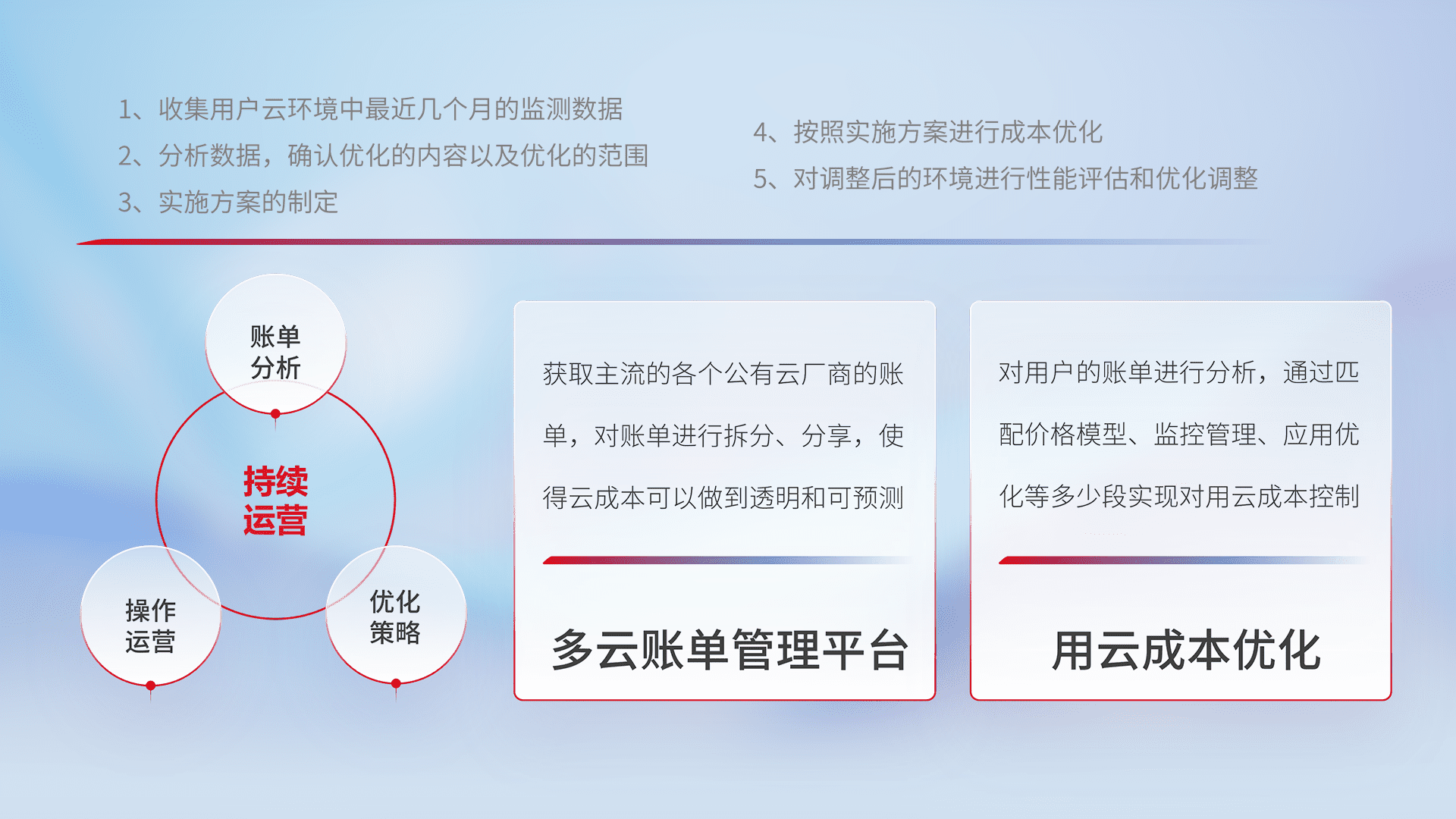 通过多云纳管,,以统一的资源数据模型把客户的云资源进行抽象和封装,,,进而实现对多云资源的统一操作,,,,保障云资源管理的可靠性、、、、稳定性与可用性。。。量身定制化运维内容,,,,配置、、、、开发运维、、、、补丁管理、、、备份、、、、监控、、、、认证和访问管理、、审计和日常巡检等,,保障在用云过程中的可靠度,,稳定度以及高可用率。。。